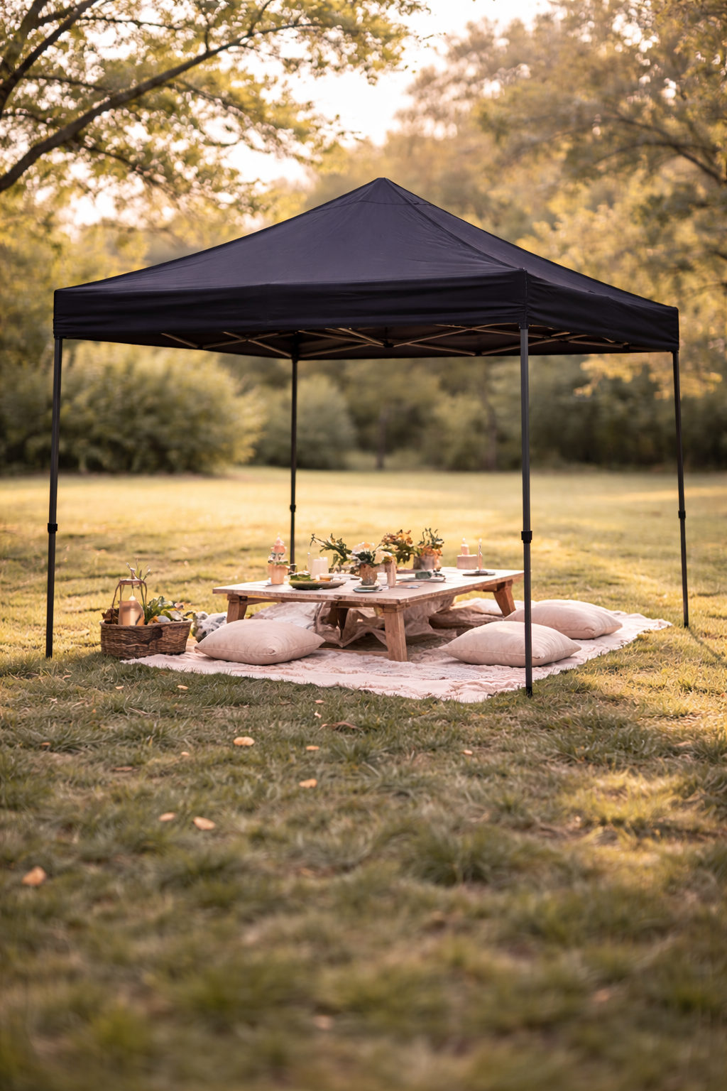A sleek black 10’×10’ pop-up canopy provides shade and structure