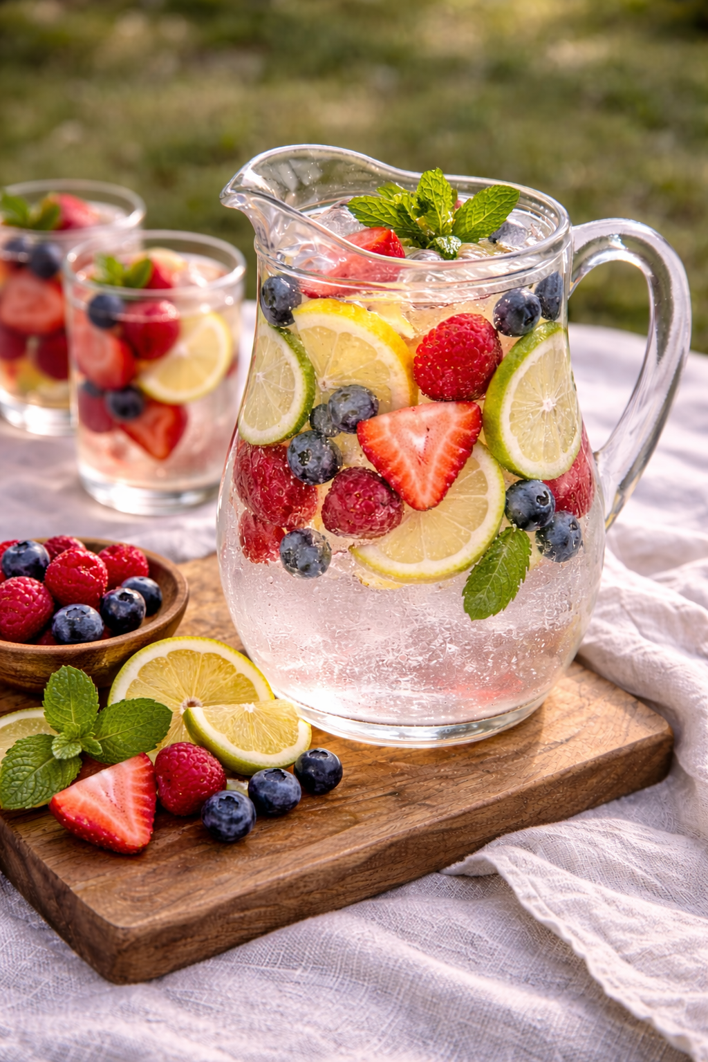 Refreshing fruit-infused water served ice cold in a clear glass pitcher with fresh seasonal fruit.
