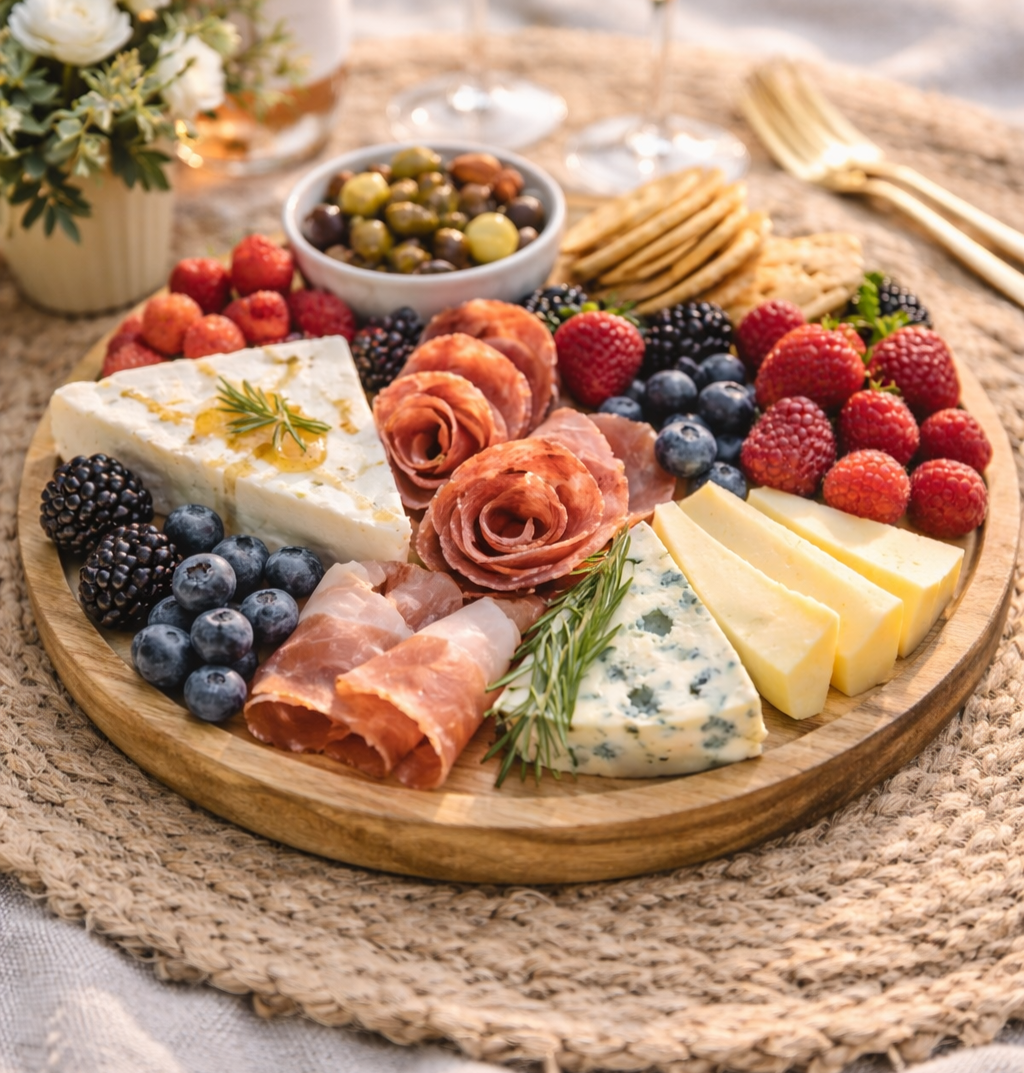 A beautifully arranged selection of artisan cheeses, cured salami, and fresh seasonal berries, crackers