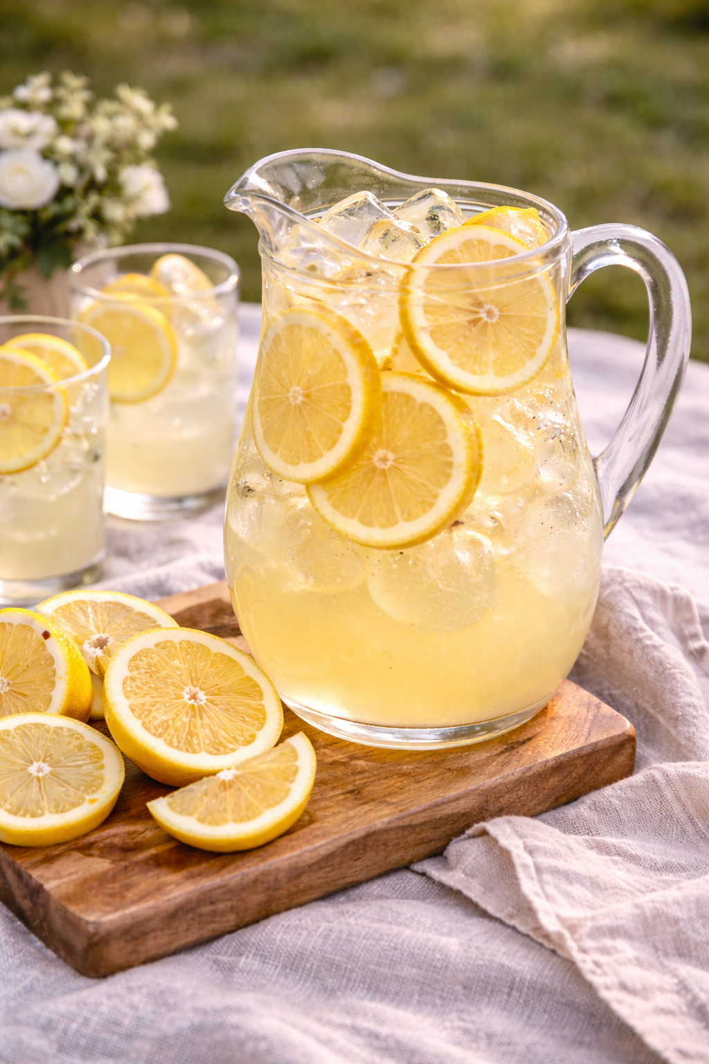 Freshly made lemonade served ice cold in a glass pitcher with bright slices of lemon